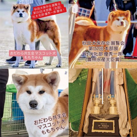 マスコット犬「もも」が、2025年12月7日に開催された秋田犬保存会 第152回 本部展(壮犬牝の部) において、優秀一席(農林水産大臣賞) を受賞いたしました。